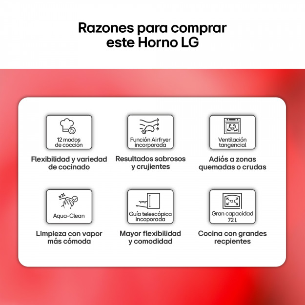 WSED7612S.BSTQEUR Horno LG Instaview 76 litros A con Air Fryer Ficha técnica de producto 799,00 € Ahorra 172,78 € 626,22 € Más información Comprar ahora Comprar ahora