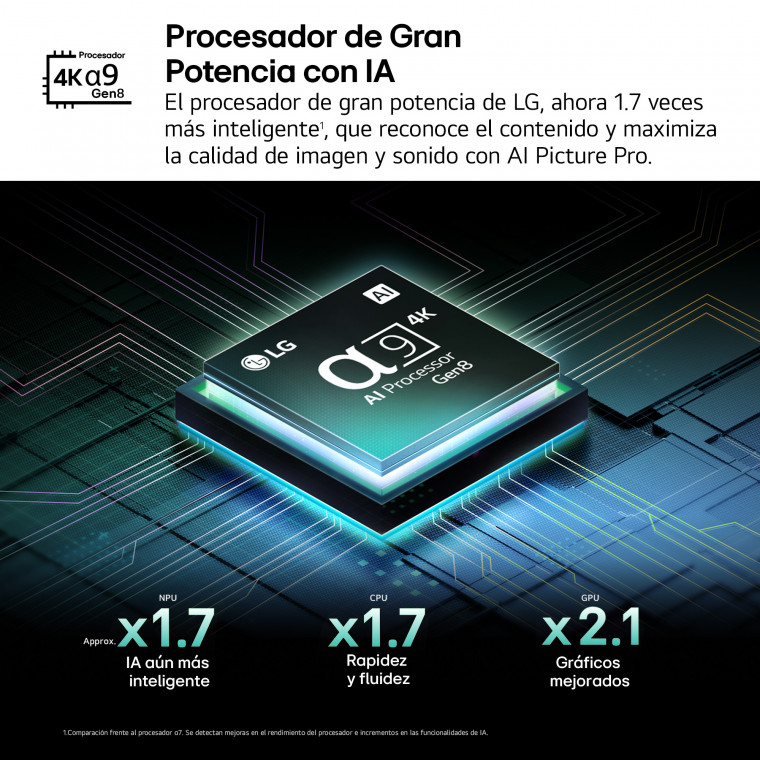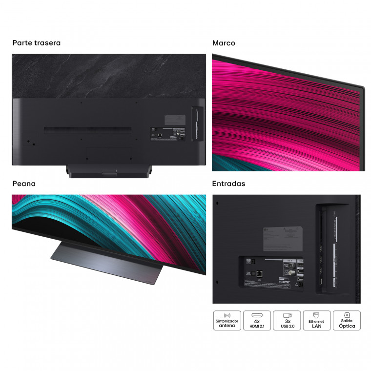 | TV de 48'' (121) cm. OLED evo 4K, 120Hz Nativos (VRR 144Hz). Smart TV webOS 25 IA con Copilot con Control por voz sin mando. IMAGEN Y SONIDO: Procesador Inteligente α9 AI Processor 4K Gen8, Pixel Dimming, Dolby Vision / HDR10 / HLG, FILMMAKER MODE™, Potencia Total: [48"] 40W [42"] 20W, [48"] Woofer : 20W, 10W Por Canal [42"] 10W Por Canal, [48"] 2.2 Canales [42"] 2.0 Canales. FUNCIONES GAMING: nVIDIA's G-Sync, AMD FreeSync Certified TV, VRR 144Hz, Tiempo de Respuesta < 0.1ms. CONECTIVIDAD: Sintonizador DVB-T2/T, DVB-C, DVB-S2/S , 4 X HDMI 2,1, 3 X USB (v 2.0), Wi-Fi 6, Bluetooth (v 5.3) |