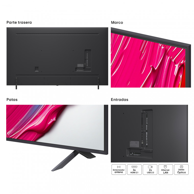 TV de 86'' (217) cm. QNED 4K, 60Hz Nativos. Smart TV webOS 25 IA con Copilot con Control por voz. IMAGEN Y SONIDO: Procesador Inteligente α7 AI Processor 4K Gen8, Local Dimming, HDR10 / HLG, FILMMAKER MODE™, Potencia Total: 20W, 10W Por Canal, 2.0 Canales. FUNCIONES GAMING: -, -, -, -. CONECTIVIDAD: Sintonizador DVB-T2/T, DVB-C, DVB-S2/S , 3 X HDMI 2.0, 2 X USB (v 2.0), Wi-Fi 5, Bluetooth (v 5.1)