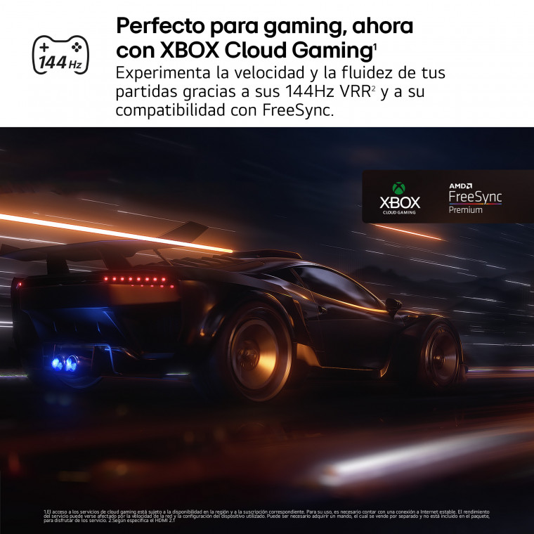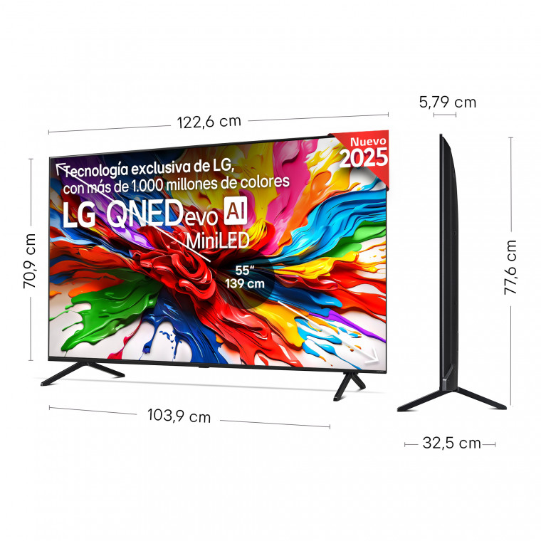 TV de 55'' (139) cm. QNED evo MiniLED 4K, 120Hz Nativos (VRR 144Hz). Smart TV webOS 25 IA con Copilot con Control por voz. IMAGEN Y SONIDO: Procesador Inteligente α8 AI Processor 4K Gen2, Precision Dimming, Dolby Vision / HDR10 / HLG, FILMMAKER MODE™, Potencia Total: 40W, Woofer : 20W, 10W Por Canal, 2.2 Canales. FUNCIONES GAMING: -, AMD FreeSync Certified TV, VRR 144Hz, -. CONECTIVIDAD: Sintonizador DVB-T2/T, DVB-C, DVB-S2/S , 4 X HDMI 2,1, 2 X USB (v 2.0), Wi-Fi 6, Bluetooth (v 5.3)