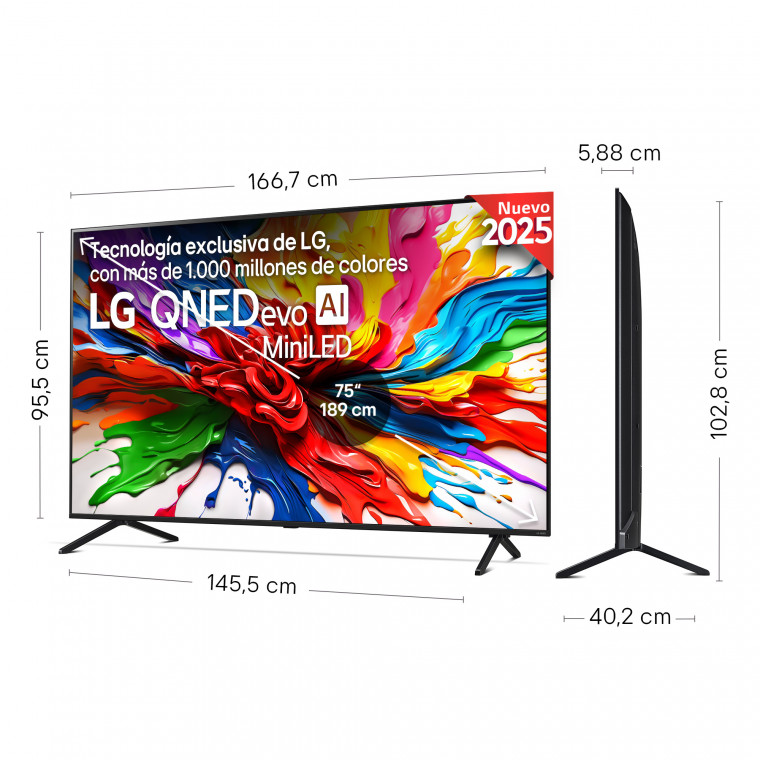 TV de 75'' (189) cm. QNED evo MiniLED 4K, 120Hz Nativos (VRR 144Hz). Smart TV webOS 25 IA con Copilot con Control por voz. IMAGEN Y SONIDO: Procesador Inteligente α8 AI Processor 4K Gen2, Precision Dimming, Dolby Vision / HDR10 / HLG, FILMMAKER MODE™, Potencia Total: 40W, Woofer : 20W, 10W Por Canal, 2.2 Canales. FUNCIONES GAMING: -, AMD FreeSync Certified TV, VRR 144Hz, -. CONECTIVIDAD: Sintonizador DVB-T2/T, DVB-C, DVB-S2/S , 4 X HDMI 2,1, 2 X USB (v 2.0), Wi-Fi 6, Bluetooth (v 5.3)