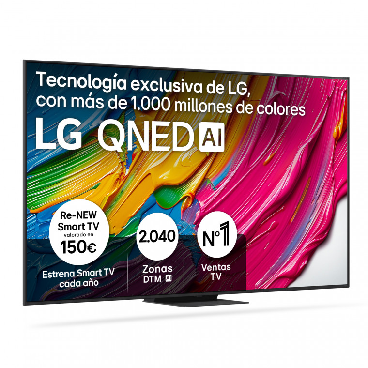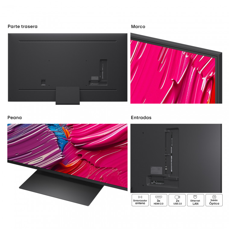 TV de 86'' (217) cm. QNED 4K, 60Hz Nativos. Smart TV webOS 25 IA con Copilot con Control por voz. IMAGEN Y SONIDO: Procesador Inteligente α7 AI Processor 4K Gen8, Local Dimming, HDR10 / HLG, FILMMAKER MODE™, Potencia Total: 20W, 10W Por Canal, 2.0 Canales. CONECTIVIDAD: Sintonizador DVB-T2/T, DVB-C, DVB-S2/S , 3 X HDMI 2.0, 2 X USB (v 2.0), Wi-Fi 5, Bluetooth (v 5.1)